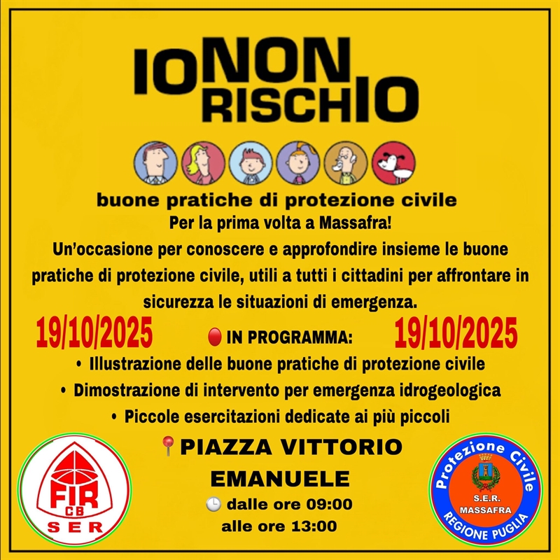 Si svolgerà domenica 19 ottobre dalle 9 alle 13 in piazza Vittorio Emanuele la prima edizione massafrese della campagna nazionale «Io non rischio», promossa dal Dipartimento Nazionale di Protezione Civile dove ha aderito l’associazione locale SER Massafra Protezione Civile, federata della struttura nazionale FIRCB.