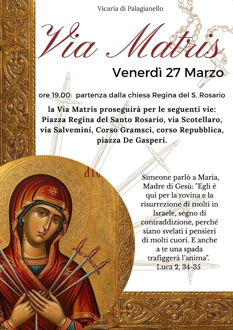 La vicaria di Palagianello celebra domani, venerdì 27 marzo, il pio esercizio della Via Matris, un rito itinerante che attraverserà le strade del centro cittadino per meditare sui sette dolori della Vergine Maria. La manifestazione religiosa avrà inizio nella parrocchia Regina del Santo Rosario, dove la comunità si ritroverà per un pomeriggio di spiritualità che culminerà nella processione serale lungo un percorso che toccherà i punti nevralgici del paese.