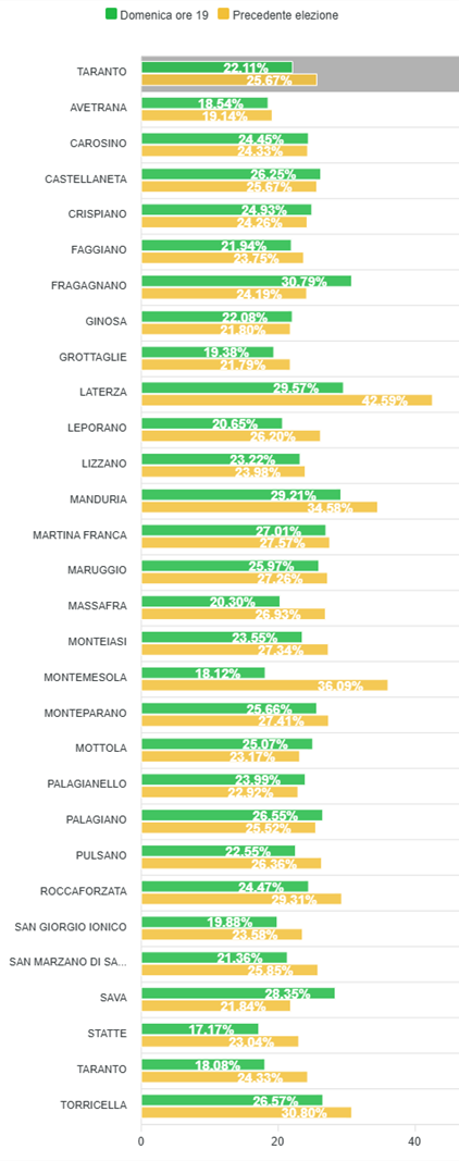 A livello provinciale, Taranto registra un’affluenza del 22,11 % (nel 2020 era 25,67 %), mentre il dato regionale si attesta all’23,77 % (nel 2020 era 27,10 %).