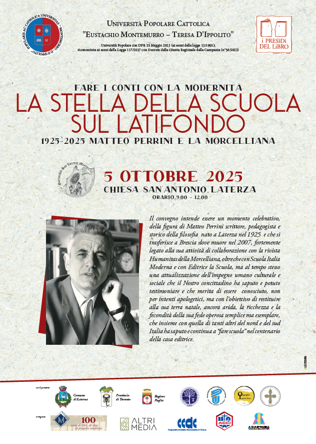 L’Università Popolare Cattolica Montemurro D’Ippolito con sede a Portici, su proposta del delegato per Matera e Taranto Giampiero De Meo e del rettore Ciro Romano, organizza il convegno “La stella della scuola sul latifondo: 1925-2025 Matteo Perrini e la Morcelliana”.