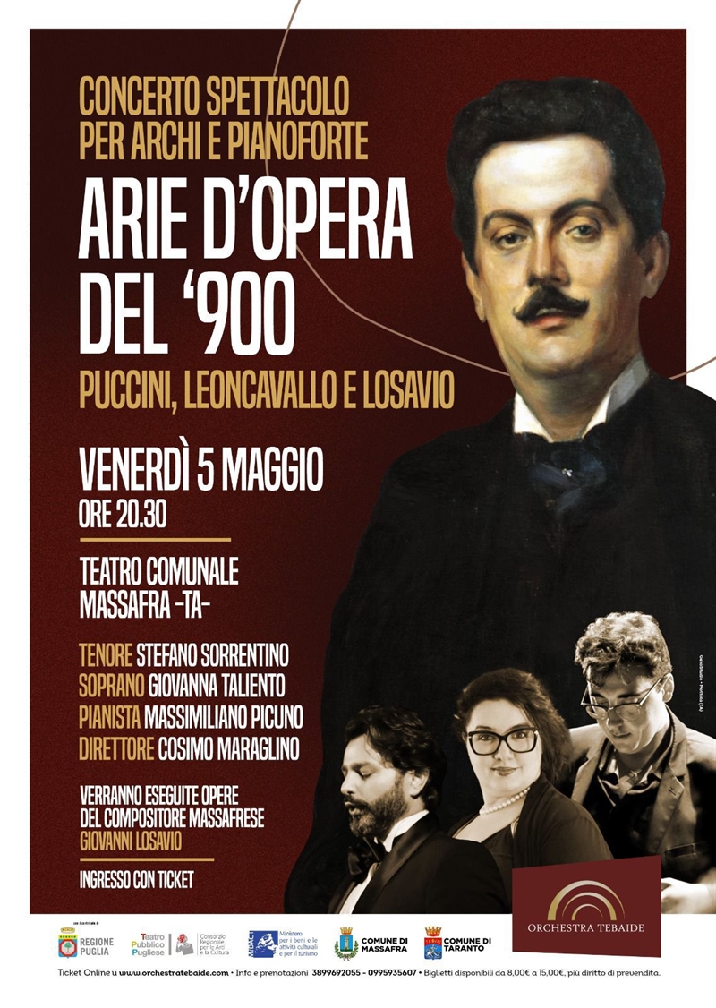 Venerdì 5 maggio, alle 20, al teatro comunale Nicola Resta di Massafra, l’orchestra Tebaide d’Italia diretta dal maestro Cosimo Maraglino porterà in scena lo spettacolo musicale "Arie d’opera del ‘900", concerto spettacolo per archi e pianoforte con musiche di Puccini, Leoncavallo e Losavio.