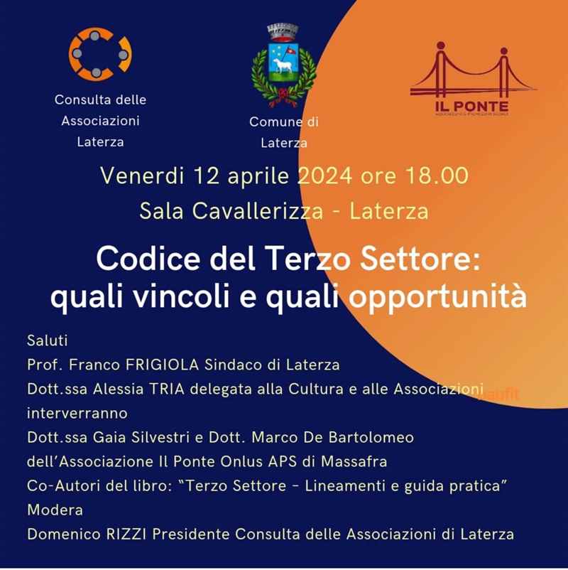 Venerdì 12 aprile, alle 18, nella sala Cavallerizza di Laterza, si terrà un incontro dal titolo "Codice del Terzo Settore: Quali vincoli e quali opportunità".