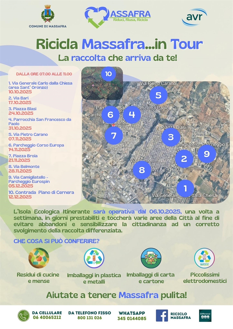 Partirà dal 6 ottobre la nuova iniziativa “Ricicla Massafra… in Tour”, il progetto promosso dal Comune di Massafra con l’assessorato ad Agricoltura, Ecologia e Ambiente guidato dal vicesindaco Giuseppe Maggiore.