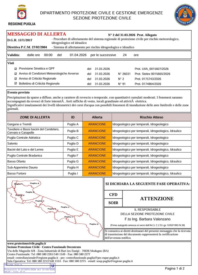 Il dipartimento della Protezione Civile della Puglia ha emesso oggi, martedì 31 marzo, un messaggio di allerta arancione per rischio idrogeologico, per temporali e idraulico che interesserà l'intera area dello Ionio e i comuni di Taranto, Massafra, Mottola, Palagiano, Palagianello, Castellaneta, Laterza e Ginosa per le successive 24 ore a partire dalla mezzanotte di mercoledì 1 aprile.