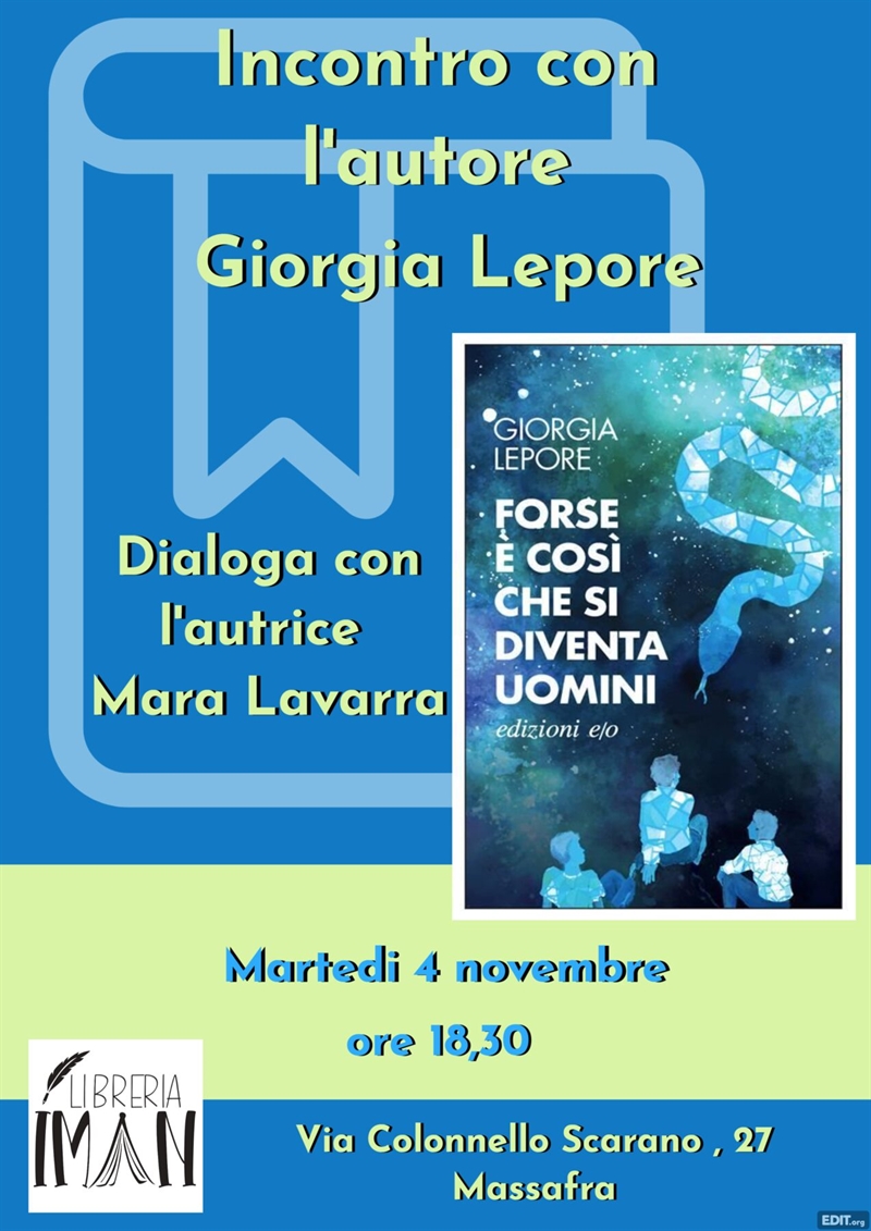 La libreria Iman di Massafra ospita questa sera, alle 18:30, la scrittrice Giorgia Lepore per la presentazione del suo ultimo romanzo Forse è così che si diventa uomini, edito da Edizioni E/O. L’incontro, curato dal libraio Salvatore Fuggiano, rientra tra gli appuntamenti culturali che la città dedica alla promozione della lettura e al dialogo con gli autori. A conversare con l’autrice sarà Mara Lavarra.