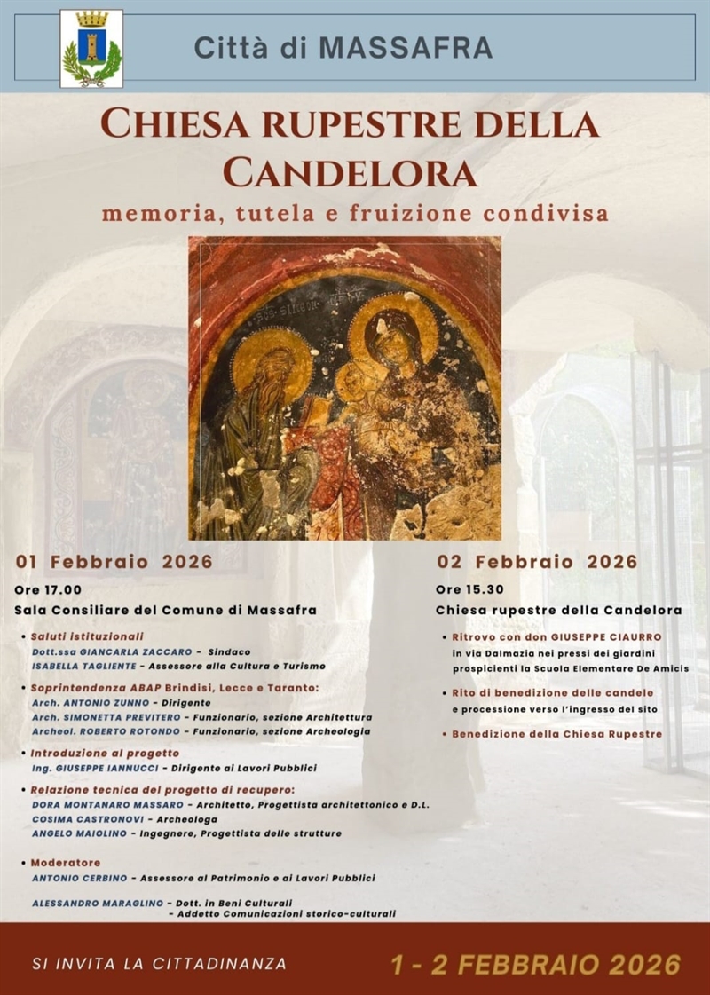 Tutto pronto per l’iniziativa dal titolo "Chiesa rupestre della Candelora: memoria, tutela e fruizione condivisa", in programma l’1 e il 2 febbraio tra la sala consiliare del Comune e la chiesa rupestre della Candelora, con l’obiettivo di presentare il progetto di recupero del sito e di accompagnarlo con momenti pubblici legati alla memoria e alla fruizione condivisa.