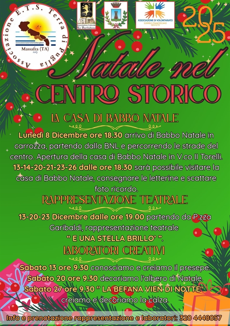 È entrato nel vivo la rassegna "Natale nel centro storico", promosso dall’associazione Ets Terra di Puglia con altre realtà associative, che fino a fine mese anima il centro storico di Massafra con l’apertura della Casa di Babbo Natale, rappresentazioni teatrali itineranti e laboratori creativi dedicati ai bambini, con l’obiettivo di favorire aggregazione, solidarietà e partecipazione.