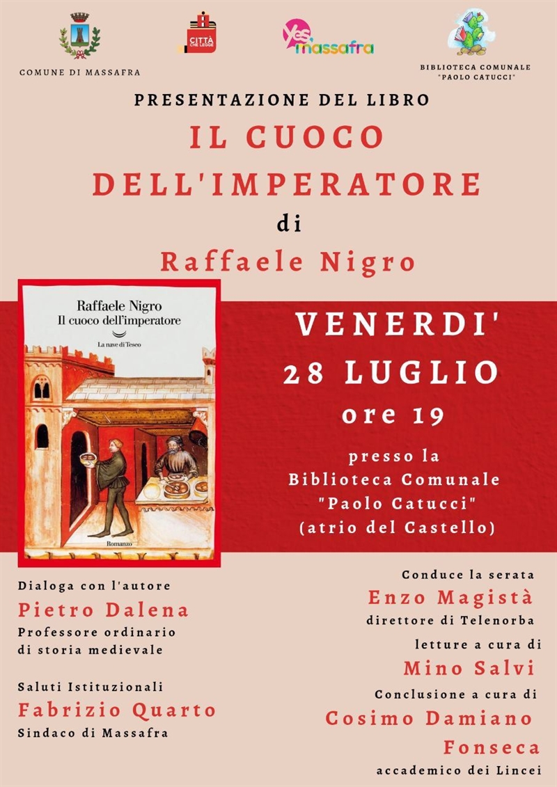 Venerdì 28 luglio, alle 19, la biblioteca comunale Paolo Catucci, nell’atrio del castello medievale di Massafra con ingresso da via Lopizzo, promuove la presentazione del libro “Il cuoco dell’imperatore” di Raffaele Nigro, edito da “La nave di Teseo”.