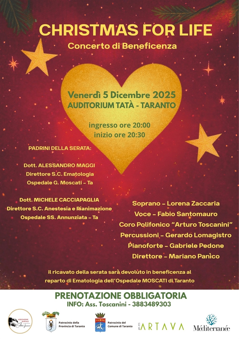 Sarà l’auditorium TaTÀ, il prossimo 5 dicembre, a ospitare il concerto di beneficenza “Christmas for life”, iniziativa organizzata dall’associazione musicale “Arturo Toscanini” con la collaborazione di Artava, Méditerranée e il patrocinio di Comune e Provincia di Taranto.