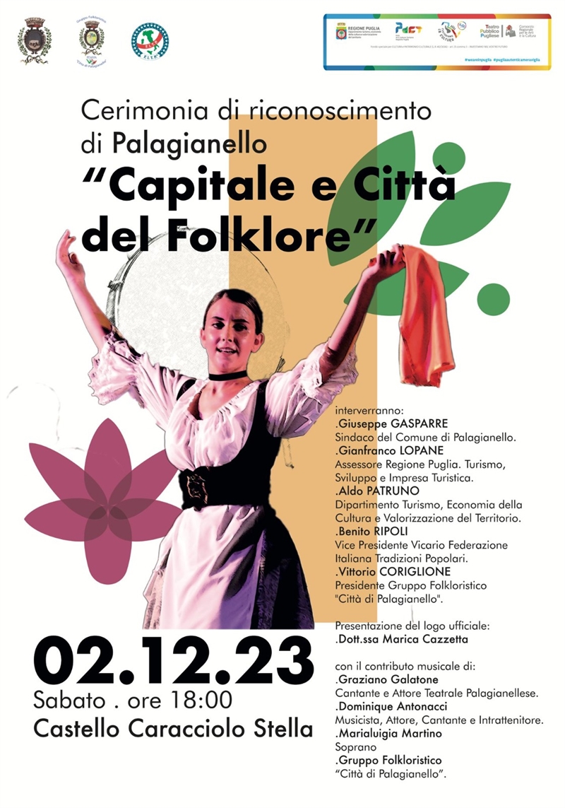 Sabato 2 dicembre, alle 18 nella sala del Castello Stella Caracciolo, il Comune di Palagianello sarà insignito dalla “Federazione Italiana Tradizioni Popolari” e dalla Regione Puglia del riconoscimento di “Capitale del Folklore” e “Città del Folklore”.