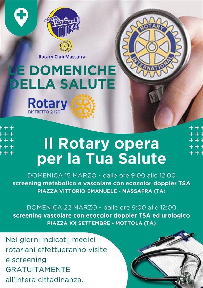 Le "Domeniche della Salute" costituiscono uno dei pilastri storici dell'azione rotariana sul territorio. Nel corso del tempo, l'offerta specialistica si è ampliata includendo branche quali la diabetologia, la cardiologia e l'odontoiatria. Un'attenzione particolare è stata rivolta anche ai più giovani: il club ha infatti promosso regolarmente screening oculistici negli istituti scolastici di Massafra, Mottola e Palagiano.