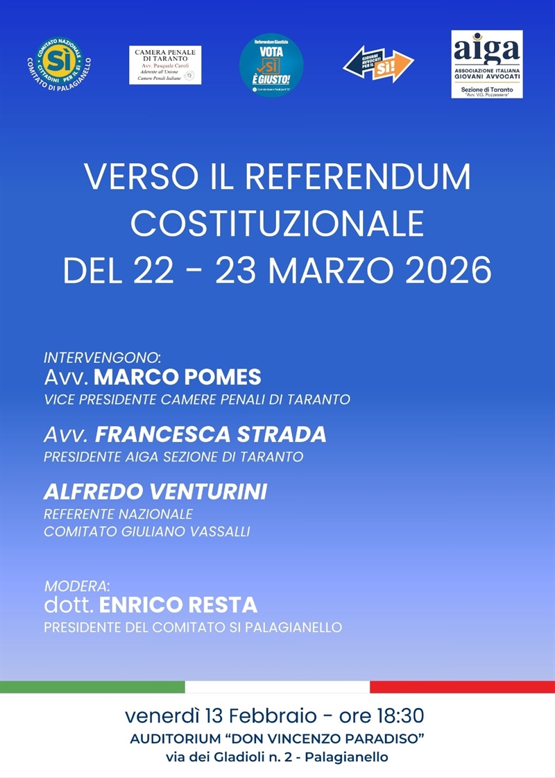 In vista della consultazione referendaria fissata per le giornate del 22 e 23 marzo 2026, il dibattito sulle riforme istituzionali approda a Palagianello con un appuntamento di approfondimento tecnico e politico.