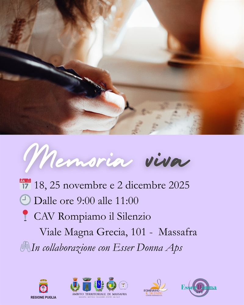 Memoria viva è promosso in collaborazione con Esser Donna Aps e rientra nelle attività sostenute dalla Regione Puglia e dall’Ambito Territoriale di Massafra. Un’iniziativa che unisce ascolto, scrittura e consapevolezza, offrendo strumenti delicati ma profondi per sostenere percorsi di autodeterminazione.
