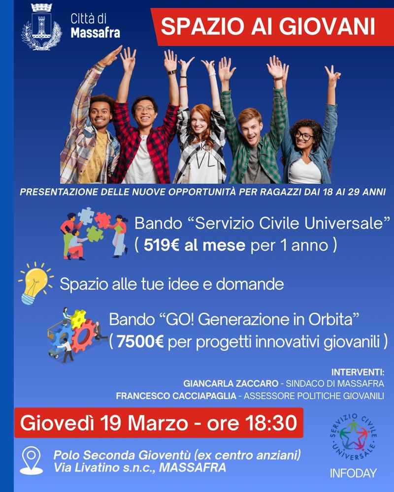 L'assessorato alle Politiche Giovanili del Comune di Massafra ha organizzato un incontro pubblico per illustrare le opportunità del Servizio Civile Universale e del bando regionale GO! Generazione in Orbita, che si terrà domani, giovedì 19 marzo, alla 18:30 nella sede del Polo Seconda Gioventù in via Livatino per favorire la partecipazione attiva dei cittadini tra i 18 e i 29 anni.