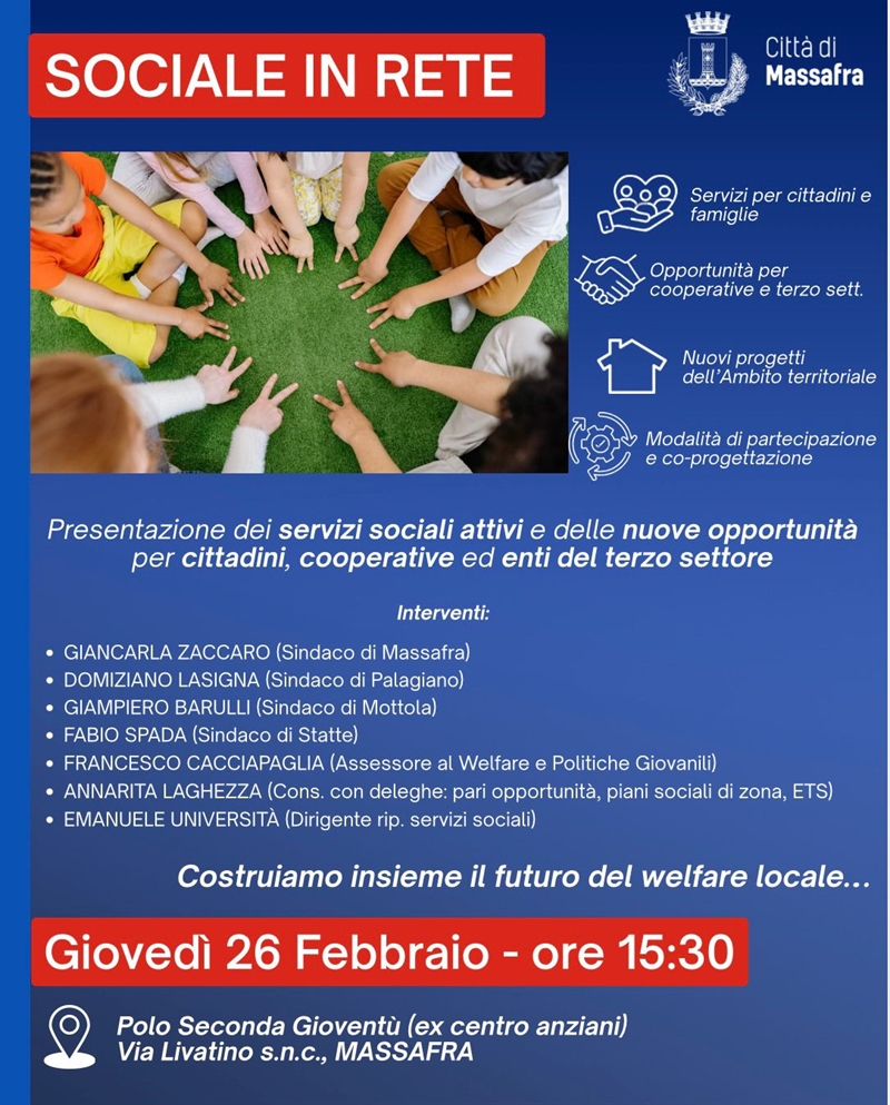 I Comuni di Massafra, Palagiano, Mottola e Statte presentano alla cittadinanza e agli operatori del settore l’iniziativa "Sociale in Rete" domani, giovedì, alle 15:30 nella sede del polo Seconda Gioventù in via Livatino per illustrare i servizi attivi e le nuove possibilità di finanziamento nel campo del welfare locale.