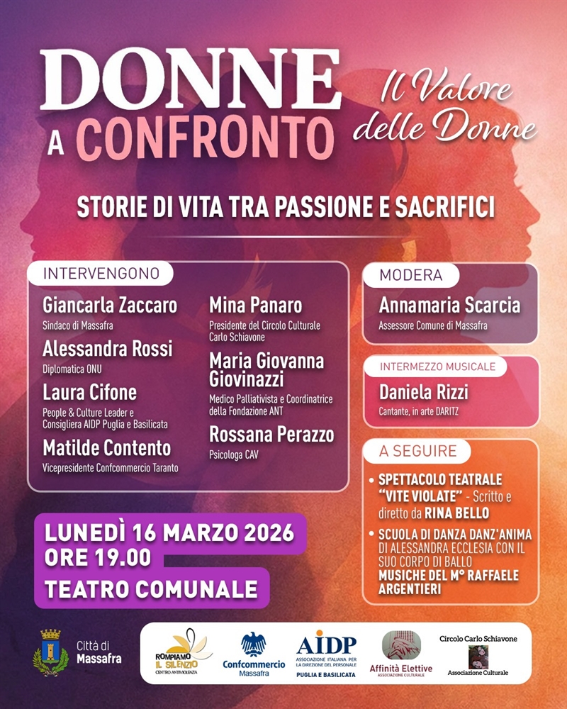 L'amministrazione comunale di Massafra promuove per lunedì 16 marzo l'incontro intitolato "Donne a confronto", un evento pubblico dedicato al ruolo femminile nella società contemporanea che si terrà nel teatro comunale Nicola Resta.
