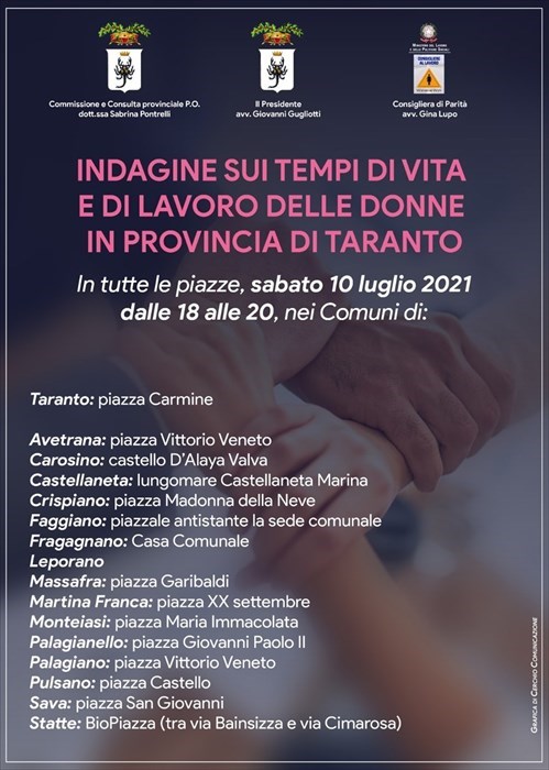 Oggi pomeriggio, dalle 18 alle 20, sarà distribuito un questionario da compilare e restituire in forma anonima ai fini di un'indagine sui tempi di vita e di lavoro delle donne in provincia di Taranto.
