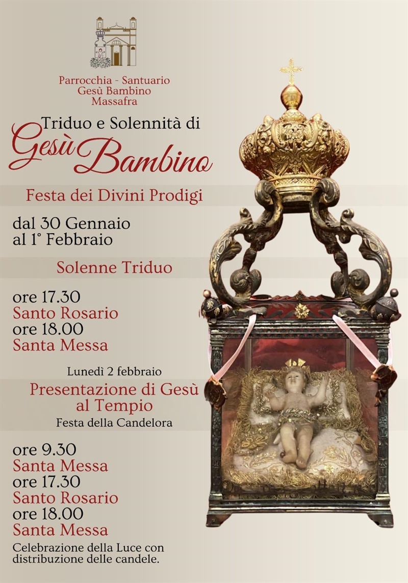 La parrocchia-santuario Gesù Bambino di Massafra celebra il triduo e la solennità di Gesù Bambino con la Festa dei Divini Prodigi dal 30 gennaio al 1 febbraio, seguita lunedì 2 febbraio dalla Presentazione di Gesù al Tempio, ricorrenza della Candelora, con un calendario di funzioni pensato per accompagnare la comunità nei momenti di preghiera e liturgia.