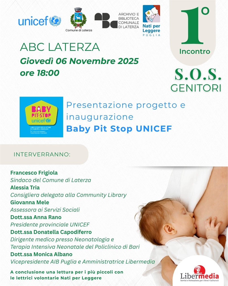 La Community Library ABC Laterza inaugurerà giovedì 6 novembre alle 18 il suo Baby Pit Stop UNICEF, uno spazio gratuito e protetto per mamme, papà e bambini, nella biblioteca comunale di Laterza.