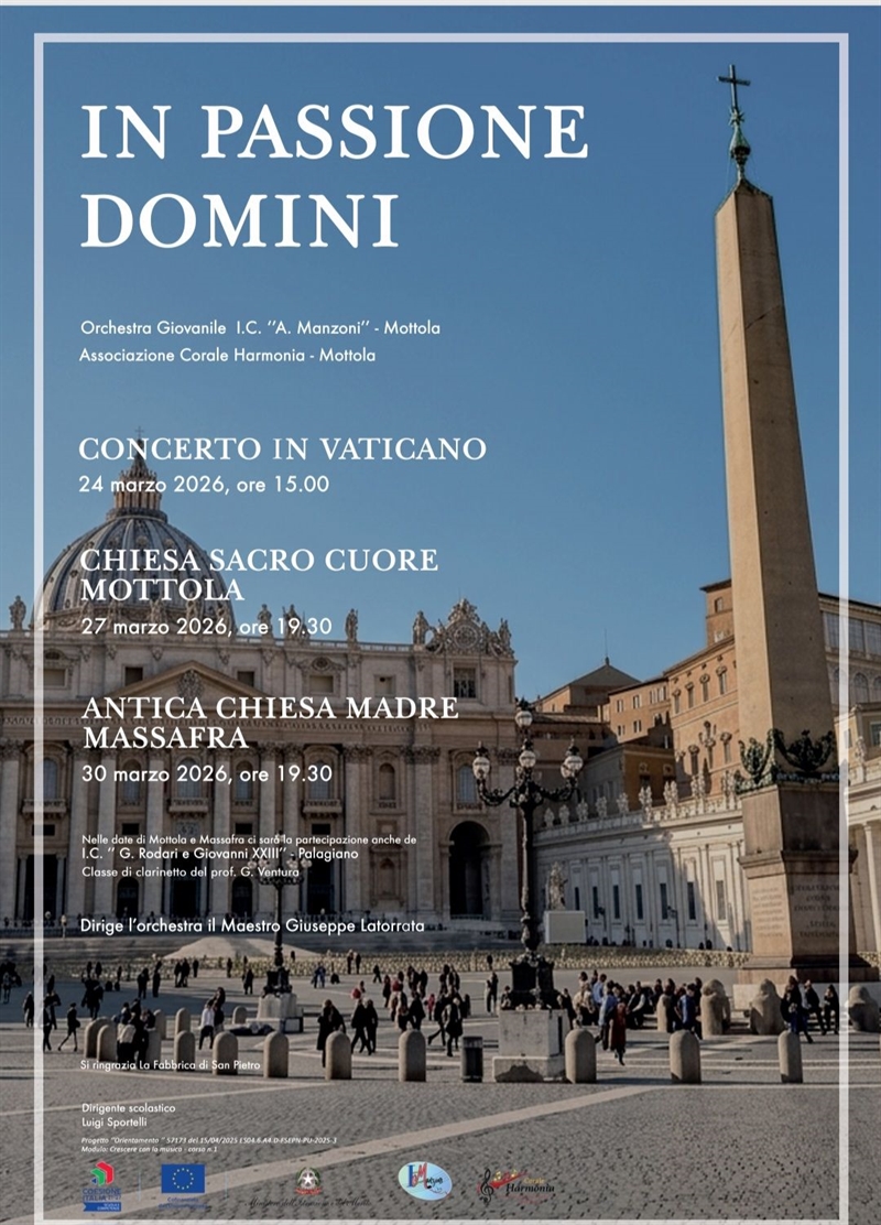 L’Orchestra giovanile dell’istituto comprensivo A. Manzoni di Mottola e l’Associazione Corale Harmonia si esibiranno in Vaticano il 24 marzo alle 15, portando nel cuore della cristianità il progetto musicale In Passione Domini. L’evento rappresenta un traguardo di prestigio per il collettivo diretto dal maestro Giuseppe Latorrata, che vedrà i giovani talenti del territorio jonico calcare uno scenario di rilievo internazionale. La trasferta romana inaugura un percorso artistico che, dopo la tappa nella Santa Sede, vedrà l’ensemble impegnato in due appuntamenti sul territorio pugliese per condividere con la cittadinanza il repertorio preparato per l'occasione.