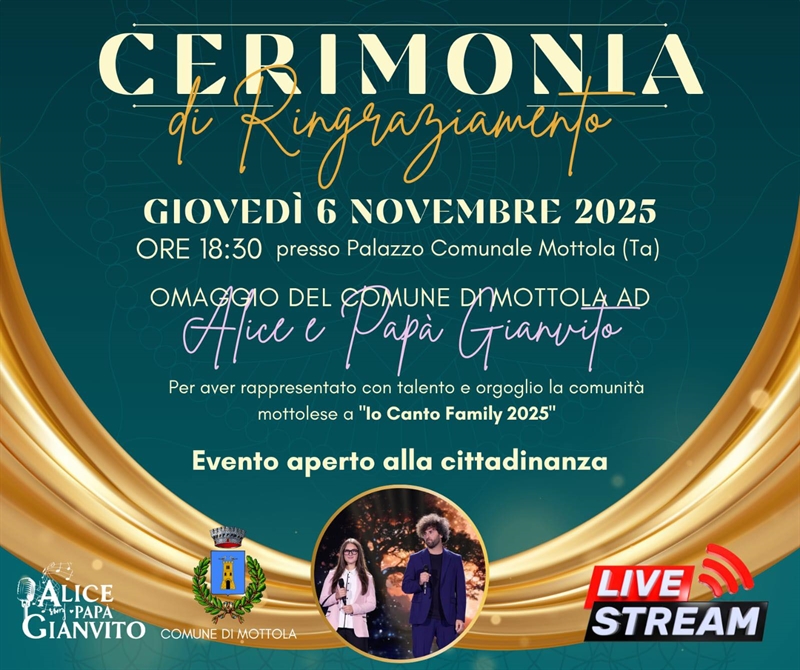Si terrà giovedì 6 novembre alle 18:30 nel palazzo comunale di Mottola la cerimonia di ringraziamento organizzata dal Comune di Mottola per rendere omaggio a Alice e papà Gianvito, protagonisti del programma televisivo Io Canto Family 2025.