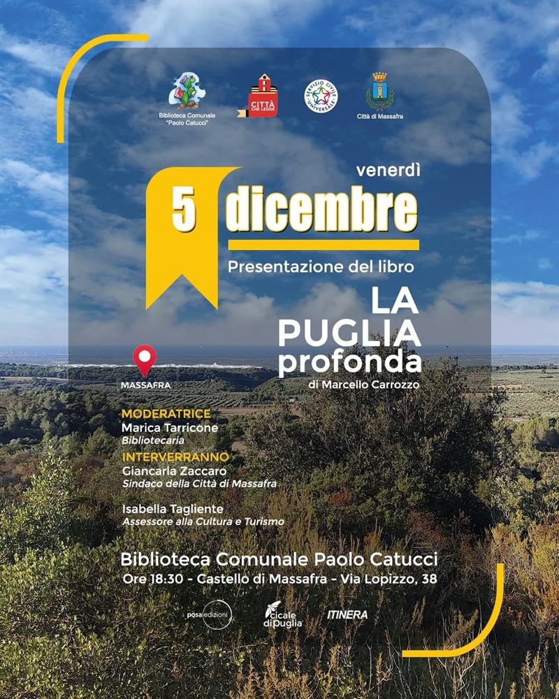 Venerdì 5 dicembre, nella biblioteca comunale Paolo Catucci nel castello di Massafra, sarà presentato il libro «La Puglia profonda» di Marcello Carrozzo, in un incontro organizzato per raccontare il territorio regionale nella sua dimensione più autentica e nascosta.